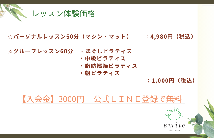 ※スタジオにヨガマット、フェイスタオル(ストレッチ用)、水分補給(薬膳茶、ウォーターサーバー)のご用意がありますので、手ぶらでお越しいただいても大丈夫です。